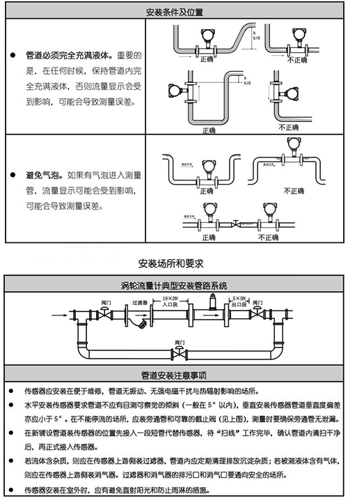 2、安装时液体流动方向应与传感器外壳上指示流向的箭头方向一致,且上游直管段应≥20dn,下游直管段应≥5dn(dn为管道内径)。