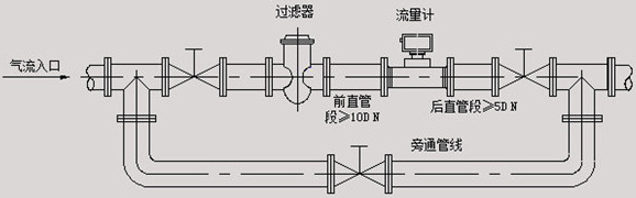 4、为了检修时不至影响液体的正常输送,应在传感器两端的直管段外安装旁通管道(如图四);