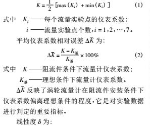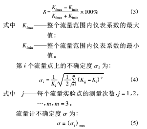 涡轮流量计的原理:当被测流体流过传感器时,在流体作用下,叶轮受力旋转,其转速与管道平均流速成正比,叶轮的转动周期改变磁电转换器的磁阻值,检测线圈中的磁通随之发生周期性变化,产生周期性的感应电势,即电脉冲信号?;谖新至髁考频牟饬吭?,根据涡轮流量计检定规程,确定了实流实验结果的评价指标,其中包括: 仪表系数、平均仪表系数相对误差、线性度和不确定度。