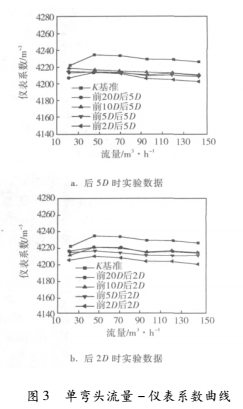b.后直管段长度对测量的影响:当前直管段较长时,后直管段对仪表系数的影响不大;随着前直管段逐渐缩短到2D时,后直管段越短造成平均仪表系数的偏差越大。