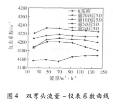a.在双弯头的各工况中,前20D仪表系数随流量的增加变化平缓,前10D和前5D有明显上升趋势,前2D有明显下降趋势,说明前10D、5D、2D的线性度较前20D的差。