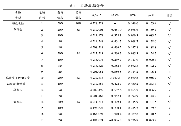 表1给出了17组实验的数据记录,认为平均仪表系数相对误差和线性度均小于0.5%,同时不确定度小于0.17%时,安装合适,进而给出安装使用涡轮流量计的建议。其中“√”表示安装的前后直管段合适;“×”表示安装的前后直管段不合适,上游阻流件对涡轮流量计的影响不能忽略。